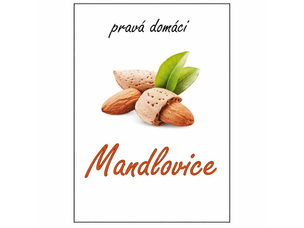 Decentná jemná etiketa na liehoviny viď. fotografia s motívom mandle a textom Pravá domáca mandľovica.
