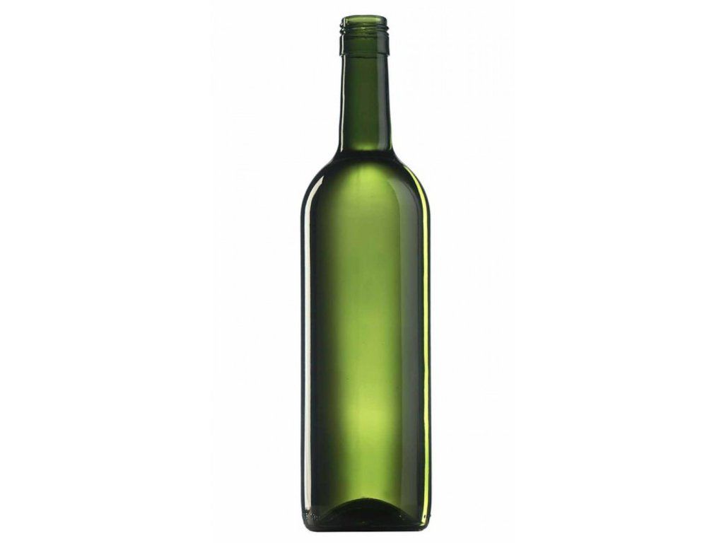 Sklenená fľaša 0,75 l na víno či ostatné nápoje olivovej farby.