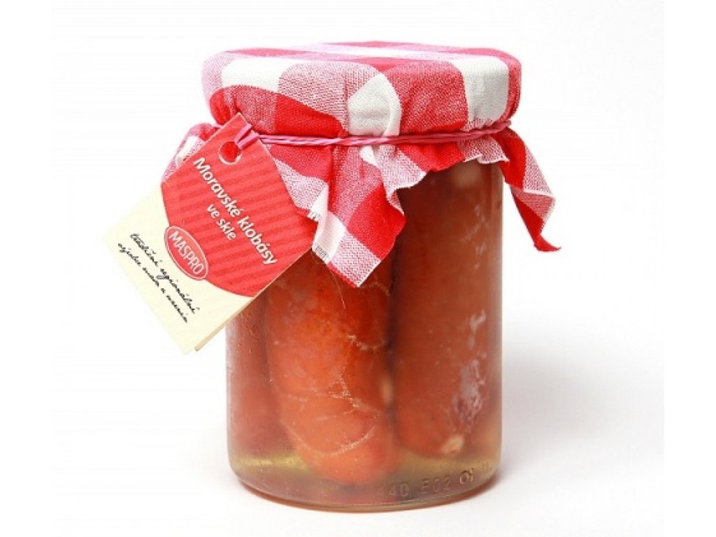 Zloženie: Moravské klobásy 68% hm. (Bravčové mäso 57%, hovädzie mäso 34%, bravčové sadlo, voda, soľ, korenie, cesnak, konzervant dusitan sodný) v okamihu spracovania, rôsol 36% (soľ, korenie).