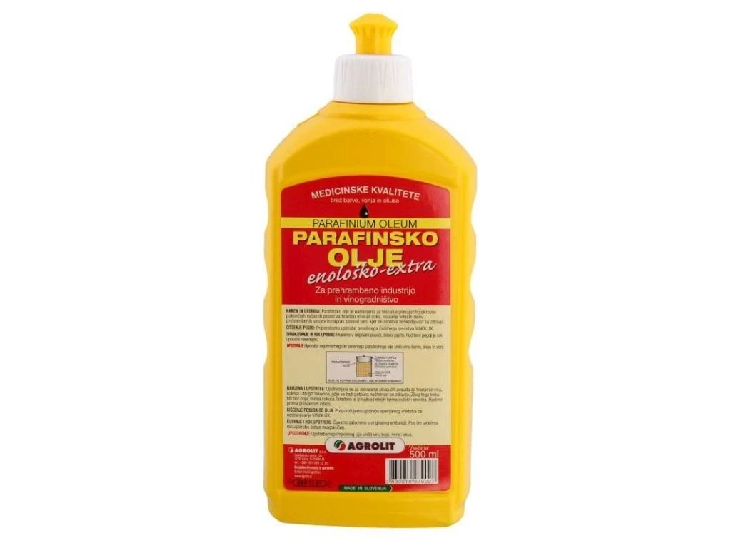 parafínový olej sa používa na utesnenie plávajúcich viek na to prispôsobených nerezových sudov na uchovávanie vína a ovocných štiav, na mazanie rotujúcich súčastí potravinárskych strojov a náprav a všade tam kde je nutná zdravotná nezávadnosť.